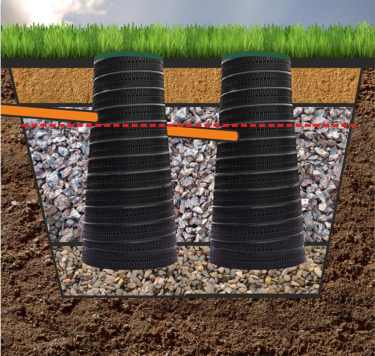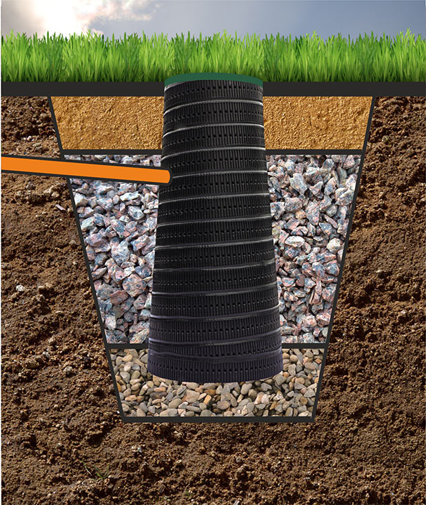 Пластиковый колодец для дренажа занимает мало места, по сравнению с полем фильтрации, которое отнимает 1 - 3 соток земли.